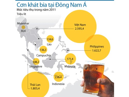 Việt Nam đứng đầu khu vực Đông Nam Á về mức tiêu thụ bia với gần 2,6 tỉ lít bia trong năm 2011, vượt xa hai nước đứng ở vị trí tiếp theo là Thái Lan và Philippines.