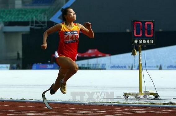 Vận động viên Nguyễn Thị Thủy đoạt Huy chương Vàng nội dung chạy 100m nữ hạng T44. (Ảnh: Huy Hùng/TTXVN)
