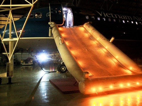 Tình huống giả định máng thuyền phao bung ra để hành khách nhanh chân khẩn nguy thoát hiểm. (Ảnh: Vietnam Airlines)
