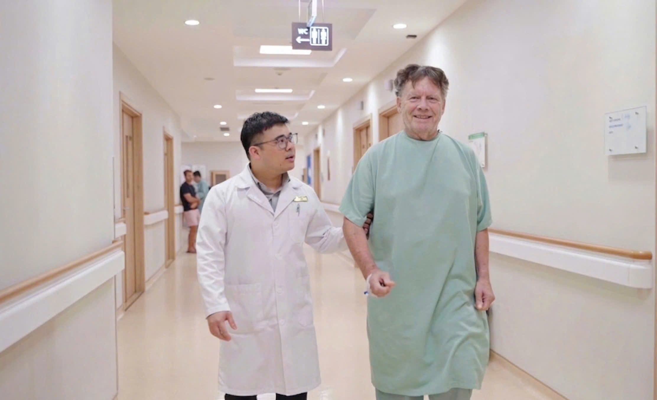 Ông Joseph tập vận động sau phẫu thuật dưới sự hỗ trợ của bác sĩ Vinmec Hạ Long.