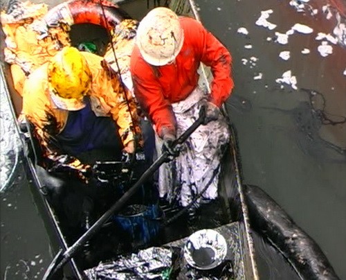 Đội ứng cứu sự cố tràn dầu cảng Dung Quất thu gom dầu tràn.