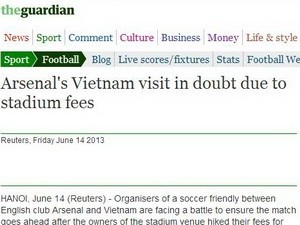 Nhiều trang báo ở Anh ngày 14/6 đã đưa tin về sự kiện chuyến du đấu của Arsenal sang Việt Nam vào mùa Hè năm nay đang đứng trước nguy cơ bị hủy bỏ do ban tổ chức không thống nhất được phí sân bãi với ban quản lý sân vận động quốc gia Mỹ Đình.