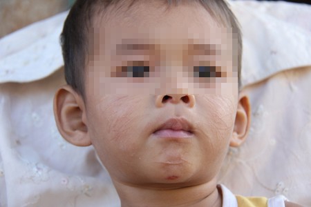 Khuôn mặt bé T hiện chằng chịt những vết sẹo do bị Dung cào, rạch.