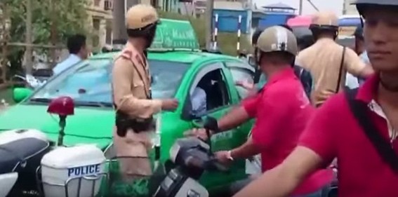 Tài xế taxi cố thủ trong xe sau khi bị CSGT và người dân đuổi theo, dừng xe. (Ảnh cắt từ Clip)