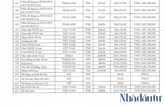 Đáng chú ý, trong danh mục các thiết bị khác với giá tổng mức mời thầu lên tới 1.460 tỷ đồng, báo giá chi tiết tới từng chén inox. Cụ thể: khay đậu Inox, chén Inox, thau Inox, muỗng nạo đặc cùng được để ở mức giá chào 24,5 USD/1 chiếc. Số lượng mỗi loại rất lớn, lên tới 2.700 chiếc mỗi loại, với tổng mức giá mỗi sản phẩm là 66.150 USD (tương đương 1,48 tỷ đồng). Như vậy chỉ nhận nguyên một gói các sản phẩm inox gồm 8 sản phẩm thì gói thiết bị inox đã lên tới hàng chục tỷ đồng.