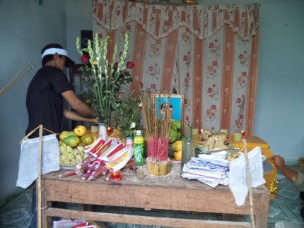 Chiều cùng ngày PV tìm về gia đình nạn nhân Hoàng Đắc Long (38 tuổi), thôn Đồng Cao, xã Đông Vinh, TP Thanh Hóa. Xe đưa tang người xấu số nằm ngay sát cổng làng, tiếng kèn trống hòa lẫn tiếng khóc, khói hương nghi ngút khiến không khí thật thê lương. Làng quê xáo động, mọi người đều thương cảm cho người đã khuất, ái ngại cho cuộc sống sau này của vợ và con anh Long.