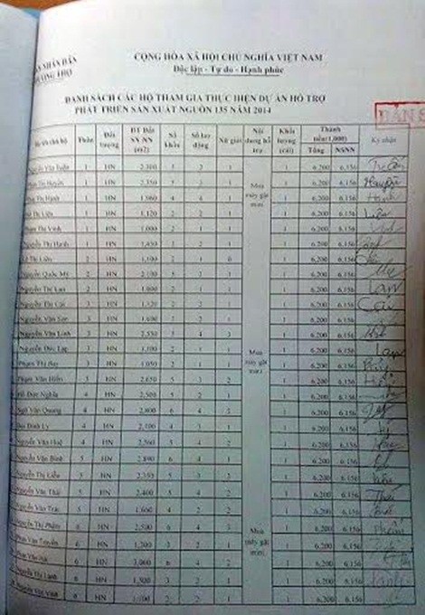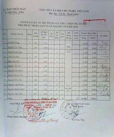 Bản danh sách được cho là xã Hương Thọ đã lập “khống” để bán các máy gặt hỗ trợ sản xuất.