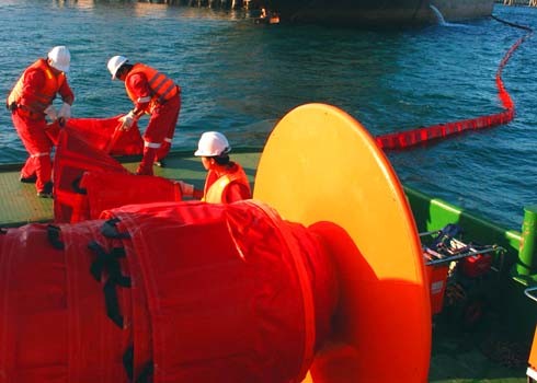 Dùng phao vây ngăn chặn sự cố tràn dầu ở cảng Dung Quất. Ảnh: VnExpress