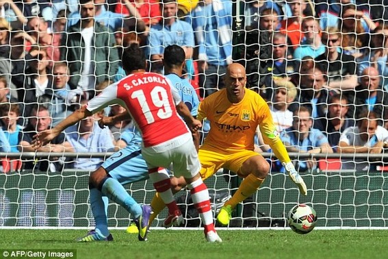 Với quyết tâm giành chiến thắng để đòi lại món nợ để mua đậm mùa trước, đoàn quân của HLV Wenger nhập cuộc đầy chủ động. Sớm đẩy cao tốc độ trận đấu và tạo ra thế trận lần lướt trước Man City, đội bóng thành London đã có được điều mình cần ở phút 21. Đường chuyền chuẩn xác của Sanogo vào vòng cấm đã đặt Cazorla vào thế thuận lợi và cú sút xa hiểm hóc của anh đã hạ gục thủ thành Caballero mở tỷ số cho Arsenal.
