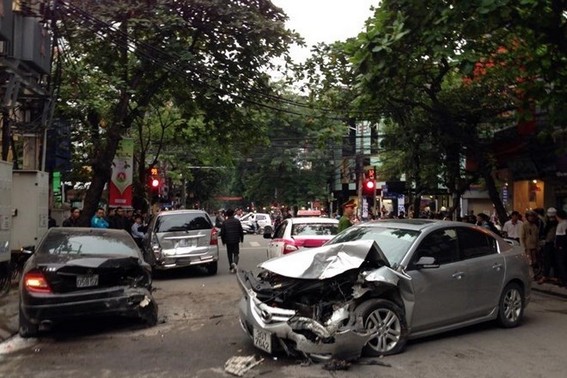 Chưa dừng lại, chiếc "xe điên" tiếp tục lao tới và đâm thêm một loạt phương tiện khác đang dừng chờ đèn đỏ tại ngã tư Bà Triệu-Trần Nhân Tông.