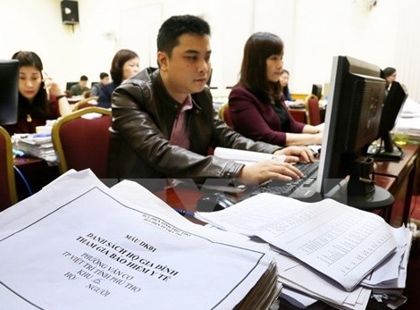 Cán bộ ngành bảo hiểm xã hội rà soát danh sách các hộ gia đình tham gia bảo hiểm y tế. (Ảnh: Trung Kiên/TTXVN)