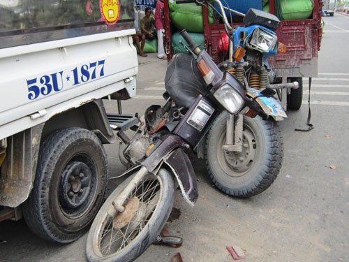 Tại hiện trường, chiếc máy của chị Loan bị hư hỏng nặng do bị chèn giữa xe buýt và xe ba gác máy, các phương tiện còn lại chỉ bị hư hỏng nhẹ.