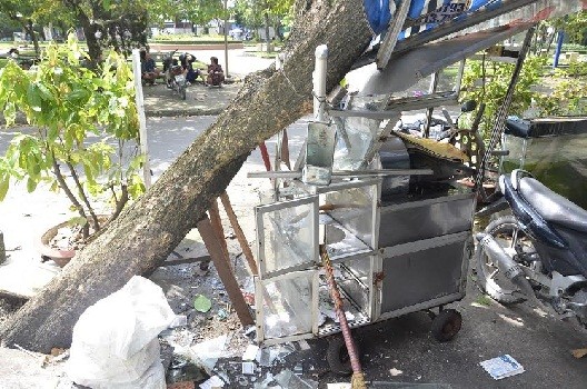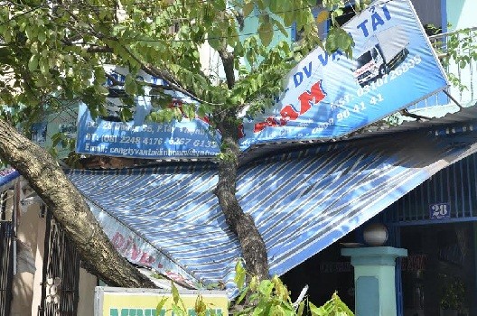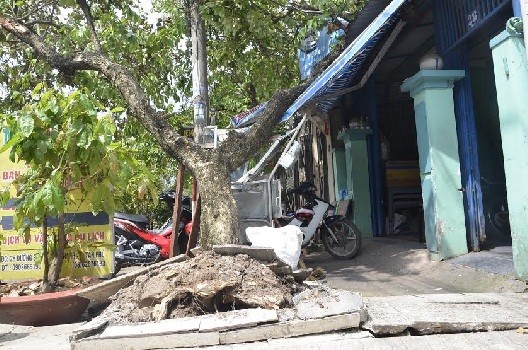 Ghi nhận tại hiện trường của PV, một cây xanh cao khoảng 10 mét, đường kính thân cây khoảng 25cm ngã đè lên phần mái nhà, nhiều đoạn dây điện, cáp viễn thông bị kéo đứt. Một xe nước mía để phía trước cũng bị chiếc xe đầu kéo tông gây hư hỏng.
