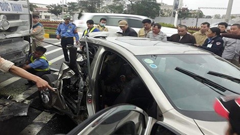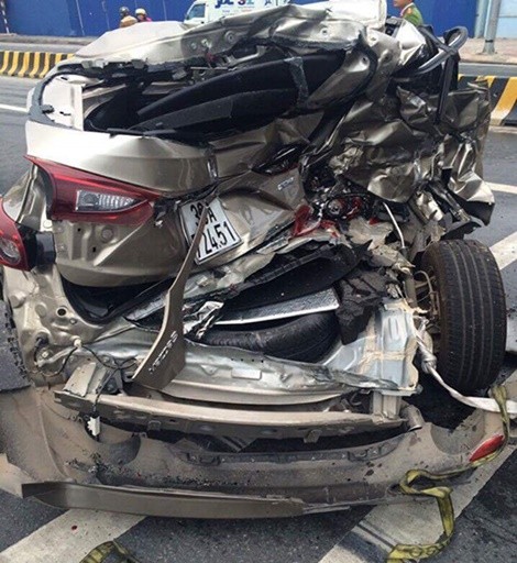 Khi đến đoạn đối diện nhà ga T1, chiếc xe này bất ngờ bị ô tô tải đầu kéo từ phía sau tông trúng. Cú tông mạnh khiến chiếc Mazda bẹp dúm phần đuôi xe. Hai người phụ nữ bên trong bị thương nặng, ngay sau đó người dân đã nhanh chóng đưa hai nạn nhân đi cấp cứu.