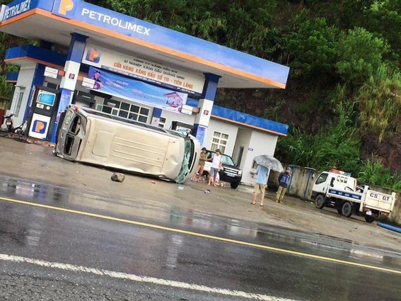 Tại hiện trường vụ tai nạn, một cột biển báo giá xăng bẹp dúm, văng ra xa, chiếc xe ô tô 16 chỗ Ford Transhit BKS 14B-010.43 lật nghiêng và hư hỏng nặng, nằm cách trụ bơm của cây xăng gần 20 mét.