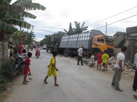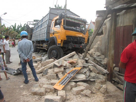 Đang lưu thông trên đường, chiếc xe tải bỗng bị mất lái, đâm vào nhà dân. Hậu quả, toàn bộ mặt tiền ngôi nhà đổ sập, 2 người trong nhà thoát chết trong gang tấc, còn tài xế bị xây xát nhẹ.
