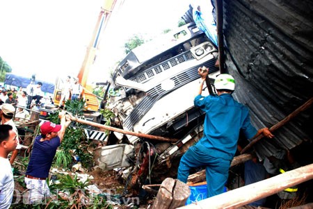 Sợ va vào các xe phía trước, tài xế Trần Ngọc Lâm đã bẻ tay lái sang tuyến đường ngược chiều và tông thẳng vào một nhà dân, gây hư hại nghiêm trọng. Hậu quả, xe tải bị lật ngược, tài xế Lâm và một phụ xe tên Minh tử vong, còn một phụ xe khác tên Bùi Ngọc Ba bị thương nặng.