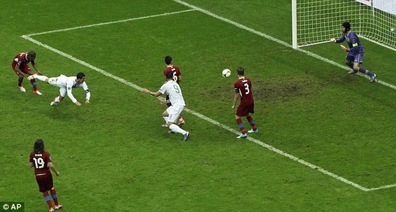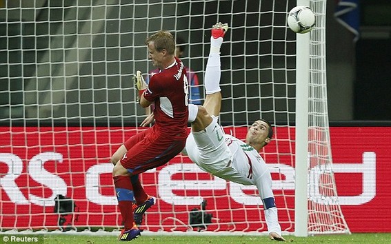 Ronaldo ngã người móc bóng trước nỗ lực truy cản của David Limbersky.