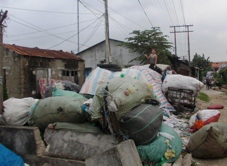 Tìm về xóm “rác”, hình ảnh đầu tiên ập vào mắt chúng tôi đó là những túp lều được dựng lên tạm bợ, cùng với đó là nhiều loại rác thải chất đầy dọc hai bên hẻm... trông rất nhếch nhác. Đi sâu vào trong xóm, chúng tôi gặp chị Lê Thị Thu Lam, 30 tuổi, đang ngồi phân loại rác. Chị Lam nói: “Cả xóm đi làm hết rồi. Giờ chỉ còn tôi và một số người già nữa ở nhà phân loại rác thôi”.