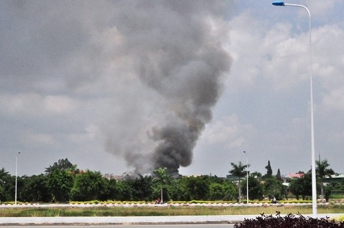 Xưởng giày cháy lớn với cột khói bốc cao nghi ngút.