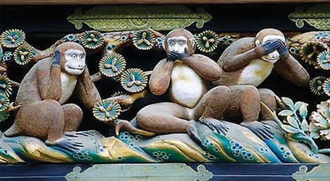 ĐS&TD - Ai đã từng tới đền Toshogu, một ngôi đền thuộc vùng Nikko (cách Tokyo chừng 140 cây số về hướng Bắc) chắc hẳn đều phải chú ý tới một bức điêu khắc cổ có tượng 3 con khỉ tên Mizaru, Kikazaru và Iwazaru bằng gỗ của nghệ nhân Hidari Jingoro rất nổi tiếng từ thế kỷ 17. Bức điêu khắc chỉ đơn giản có tên: Mizaru, Kikazaru và Iwazaru (có nghĩa là “bịt tai, bịt mắt và bịt miệng”).