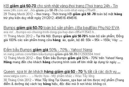 Tìm trên Google với cụm từ “hàng giảm giá 50-70%”, chúng tôi nhận được tới 7.510.000 kết quả chỉ trong 13 giây. Trong đó, chủ yếu là giảm giá các mặt hàng thời trang như giày dép, quần áo, làm đẹp, tour du lịch, đồ điện gia dụng… với mức giảm giá cực sốc từ 50- 70%. Những mẩu quảng cáo khiến nhiều người “giật mình” như “KB giảm giá 50-70% cho sinh nhật vàng”, “Đầm bầu Bumps giảm giá 50 - 70%”; “Xả hàng giảm giá 50-70%, trả tiền mua 1 được 3 áo sơ mi” trên trang enbac.vn chẳng hạn. Khi chúng tôi thực tế kiểm tra thì đó là những chiếc áo sơ mi hè chất liệu rẻ nhưng được đẩy giá gốc lên tới 350.000 - 420.000 đồng/chiếc rồi bây giờ giảm “bán đồng giá” 120.000 đồng/chiếc.
