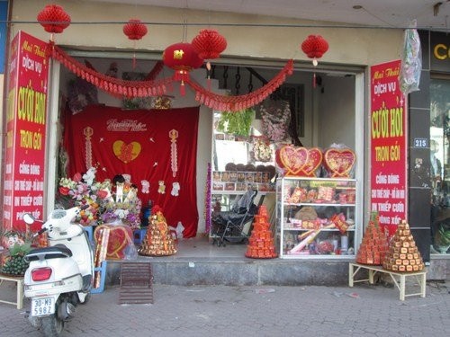 Chị Nguyễn Thị Mai, chủ cửa hàng dịch vụ cưới trên phố Cầu Giấy cho hay: Hàng nhập vào năm nay cũng ít đi. Nếu mọi năm nhập vào vài trăm triệu tiền hàng thì năm nay chỉ có vài chục triệu mỗi tháng. Khách hàng vắng bóng, có khi cả tuần mới có một đơn đặt hàng. Cỗ lễ cũng được khách hàng giảm bớt, giờ chỉ còn các lễ như cau trầu, rượu, thuốc, bánh cốm, bánh phu thê, hoa quả, sen chè. Tất cả cùng lắm chỉ 3 triệu, trong khi năm trước mỗi lễ lên đến cả chục triệu đồng.