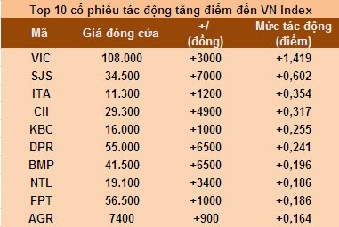Bên chiều ngược lại, tổng số điểm mà 10 cổ phiếu có mức tác động tăng điểm lớn nhất trên thị trường tuần qua lại chỉ đạt 3,92 điểm. VIC là cổ phiếu có mức tác động tăng điểm lớn nhất với 1,419 điểm. Đóng cửa phiên giao dịch cuối tuần, VNM chốt tại mức giá 108.000 đồng/cổ phiếu.