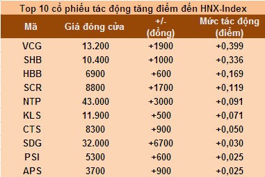 Ngược lại, số điểm mà 10 cổ phiếu có mức tác động tăng điểm giúp nâng đỡ thị trường lại đạt 1,315 điểm. VCG là mã dẫn đầu nhóm cổ phiếu có mức tác động tăng điểm lớn nhất trên HNX-Index với 0,399 điểm. Cổ phiếu này đóng cửa phiên giao dịch cuối tuần tại mức giá 13.200 đồng/cổ phiếu.