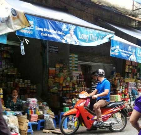 Ghé vào một tiệm kinh doanh các mặt hàng đồ uống, nước giải khát nằm trên tuyến phố này, chúng tôi không khỏi “choáng” vì sự đa dạng về “màu sắc” của các chai, lọ đựng dung dịch nước giải khát ở nơi đây. Từ dung dịch màu đỏ, xanh, tím… cho đến vàng đều xuất hiện ở nơi đây. Số dung dịch này được đựng trong các chai nhựa đính địa chỉ, nguồn gốc xuất xứ khá mập mờ… thậm chí nhiều chai còn không hề in đính kèm bất cứ một thông tin nào có liên quan cả. Và chỉ khi chủ cửa hàng là một phụ nữ tuổi ngoài 40 này giới thiệu sản phẩm, tôi mới hay đó là dung dịch sirô dâu tây(!).