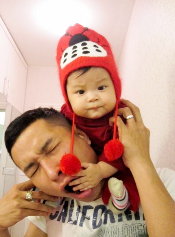 Tạo dáng đáng yêu bên cạnh papa Trung Kiên nè!