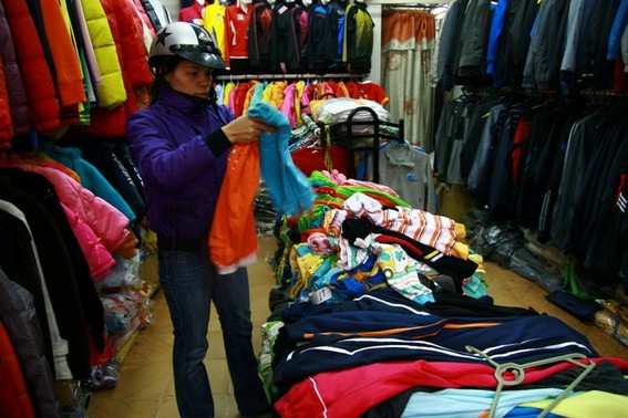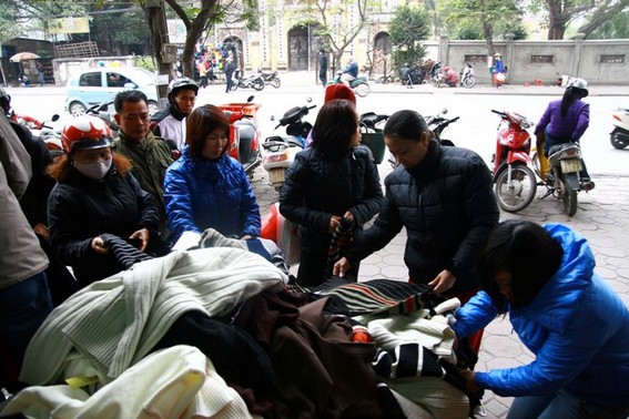 Trưa 8/12, có mặt tại “shop” phố Chùa Bộc với biển “giảm giá 10-50% nhân dịp cuối năm”, rất đông khách hàng đang lựa chọn những chiếc áo khoác trong đống hàng bày la liệt trước măt. Tất cả đều còn rất mới, thiết kế khá bắt mắt với giá chỉ 150.000 đến 200.000 đồng/chiếc.