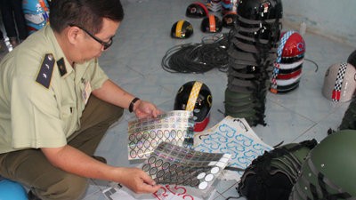 Trong vai người mua MBH số lượng lớn, chúng tôi gặp ông Lưu, chủ cơ sở chuyên lắp ráp, phân phối các loại MBH dỏm tại P.Bình Hưng Hòa B (Q.Bình Tân, TP.HCM). Ông Lưu quảng cáo hiện cơ sở của ông có hơn 30 loại mũ với đủ kiểu dáng, chất lượng và tem nhãn... Giá thành mỗi MBH cũng đa dạng từ 25.000-70.000 đồng tùy loại. Nếu muốn mua 1.000-2.000 cái chỉ cần đặt trước 2-3 ngày là có hàng. Với hơn ba năm kinh nghiệm trong việc kinh doanh MBH, ông Lưu tư vấn rành rọt: “Bây giờ loại MBH kiểu cũ (hai thành phần: vỏ và quai đeo) không “ăn hàng” nhiều như hai năm gần đây nữa. Người dân không dám mua vì sợ bị phạt. Còn nếu mua MBH loại này (mũ dỏm nhưng đủ ba thành phần - PV) mang hàng về tỉnh bán không ai kiểm tra, bởi đã có dán tem mũ thể thao.