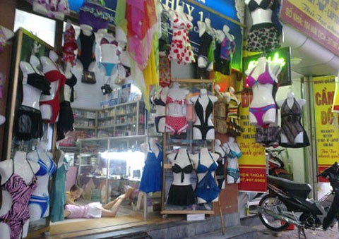 Trên các tuyến phố Quán Thánh, Hòe Nhai, Phạm Ngọc Thạch, Chùa Bộc...những của hàng bán nội y đều treo biển “Hàng mới về” với đầy đủ chủng loại áo tắm được nhập khẩu từ Thái Lan, Hàn Quốc, Quảng Châu, hàng áo tắm Việt Nam vẫn ít hơn so với hàng nhập.