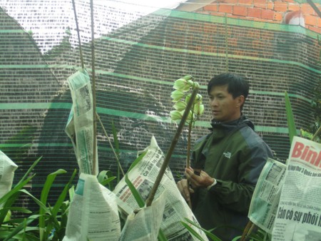 Anh Nguyễn Quang Trí đang cắt cành địa lan nở sớm để gỡ một vụ mùa thất bại.