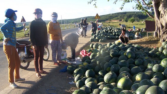 Người nông dân phải đưa dưa hấu ra quốc lộ 14 bán lẻ để gỡ gạc vốn.