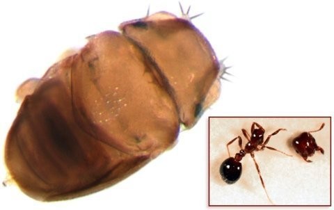 Ruồi Euryplatea nanaknihali (ảnh chính) sống ký sinh trên cơ thể một loài kiến.