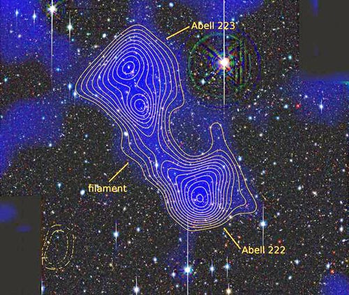 Giới chuyên gia dễ dàng theo dõi được ánh sáng bị bẻ cong bởi các nút thắt vật chất tối đậm đặc lấp đầy các cụm thiên hà. Tuy nhiên, các sợi mỏng, thưa thớt đóng vai trò kết nối các cụm thiên hà lại khó được xác định hơn, vì như đã nói ở trên nó ít hấp thu hoặc phản ánh sáng. Các cuộc nghiên cứu trước đây đưa ra tuyên bố đã tìm được sợi vật chất tối, nhưng sau đó đều bị phát hiện là làm giả mạo hoặc kết quả không thích đáng, cho đến giờ phút này. Nhờ vào vận may, nhóm của ông Dietrich tìm ra một mục tiêu ngàn năm có một: 2 cụm thiên hà ở vị trí hết sức gần nhau, tạo cơ hội hiếm thấy cho các chuyên gia đang truy tìm dấu vết của sợi vật chất tối liên kết chúng. Bộ đôi thiên hà này được đặt tên là Abell 222 và Abell 223, cách trái đất khoảng 2,7 tỉ năm ánh sáng.