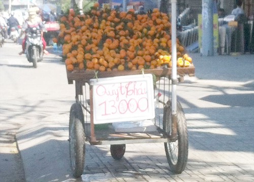 Trên các tuyến đường Nguyễn Thái Sơn, Nguyễn Văn Lượng (quận Gò Vấp), Cách Mạng Tháng Tám, Tô Hiến Thành (quận 10)… hàng loạt xe đẩy chất đầy quýt, gắn bảng ghi “Quýt Thái” 26.000 đồng một kg. Người bán mau miệng mời chào: “Quýt Thái Lan ngon ngọt, hàng đảm bảo tươi mới, xem cuống lá còn xanh thế này thì không sợ hàng cũ”.