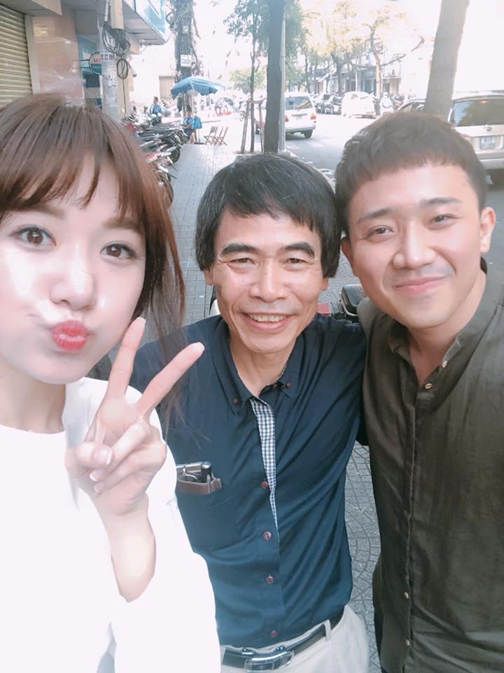 Hari Won tươi rói bên ông xã Trấn Thành trong buổi quay hình sáng nay.