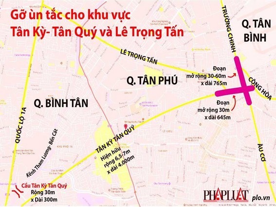 Theo ông Ninh, tới đây TP sẽ đầu tư 2.606 tỉ đồng để thực hiện hai dự án mở rộng đường Trường Chinh và Tân Kỳ Tân Quý. Cụ thể, sẽ mở rộng đường Trường Chinh đoạn từ đường Cộng Hòa đến đường Âu Cơ dài 765 m, rộng 30 m (hiện nay rộng khoảng 10-12 m) cho sáu làn xe lưu thông với kinh phí 278 tỉ đồng. Cùng lúc sẽ nâng cấp, mở rộng đường Tân Kỳ Tân Quý đoạn từ đường Cộng Hòa đến đường Lê Trọng Tấn, dài 644,8 m, rộng 30 m (hiện nay rộng khoảng 8 m) cho sáu làn xe với vốn xây dựng 96 tỉ đồng.