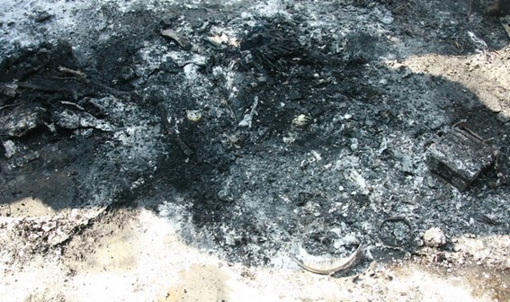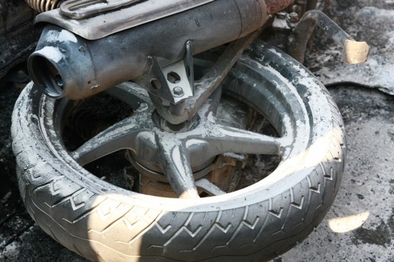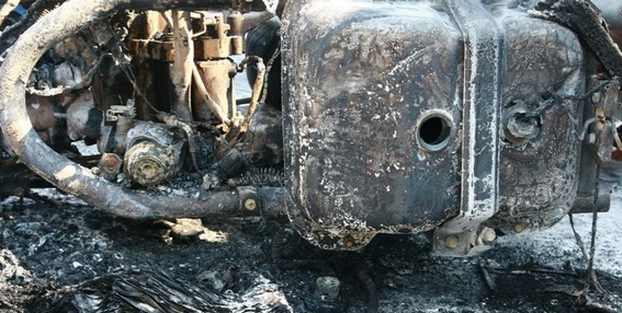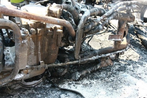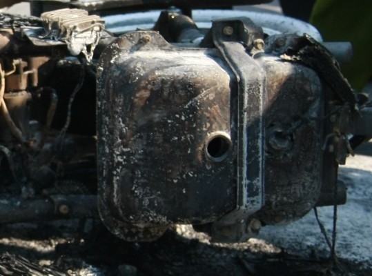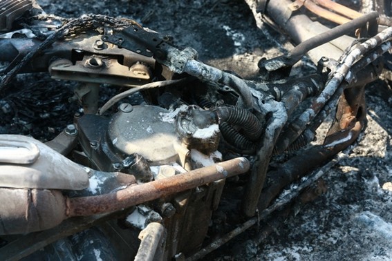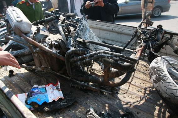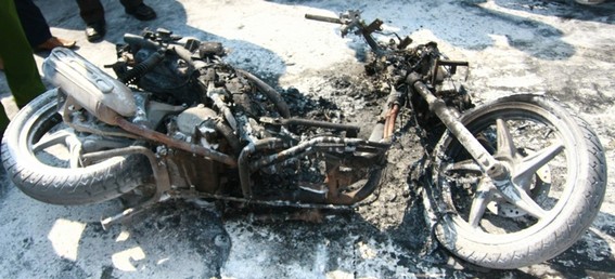 Tại hiện trường, đám cháy đã được lực lượng chức năng dập tắt. Chiếc xe máy chỉ còn lại khung sắt, tất cả phần vỏ bên ngoài bị cháy hết, biển số xe không nhìn rõ do biến dạng.