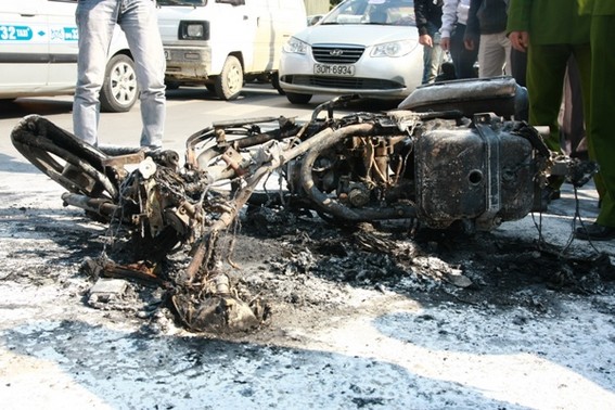 “Chiếc xe SH của một người đàn ông khoảng 40 tuổi đi từ hướng Kim Mã về khách sạn Daewoo, sau khi va quệt nhẹ với ô tô đổ xuống đường, người này tiếp tục dựng xe lên để đi tiếp thì bỗng dưng xe bốc cháy” Bác Ngô Trọng Luyến lái xe ôm - chứng kiến toàn bộ sự việc kể lại.