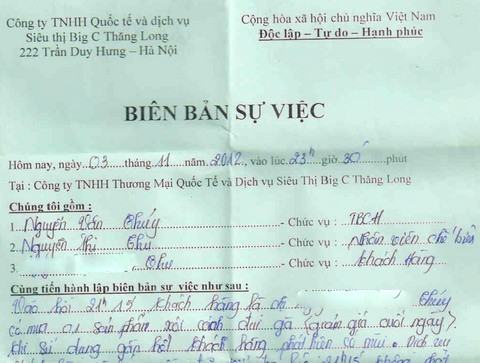 Biên bản do nhân viên Big C lập nhưng không ký nhận.