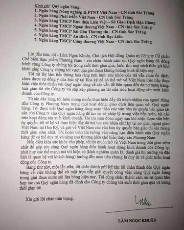 Trong thư, ông Khuân luôn nhận mình là người đứng đầu Công ty Phương Nam, rất mong muốn thực hiện đầy đủ trách nhiệm với các chủ nợ là ngân hàng. Mong muốn bàn giao tài sản, thương hiệu thủy sản Phương Nam lại cho các ngân hàng, tái cơ cấu và vực dậy giúp doanh nghiệp. Đó là nơi ông Khuân, cùng các thành viên trong HĐQT của gia đình và hàng ngàn công nhân lao động biết bao thời gian qua, đổ bao công sức, mồ hôi và cả nước mặt dựng nên cơ đồ.