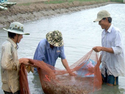 Thu hoạch tôm nuôi ở H.Cầu Ngang, Trà Vinh - Ảnh: Hoài Phong