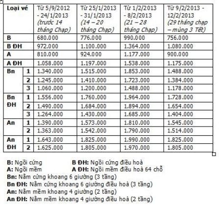 Bảng giá vé tàu SE2 đi từ Sài Gòn đến Hà Nội dịp cao điểm Tết 2013