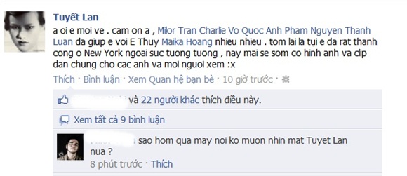 Điều mà Tuyết Lan nhấn mạnh ở đây chính là “sớm có hình ảnh và clip dẫn chứng” để chứng tỏ Tuyết Lan và Hoàng Thùy có tham dự NewYork Fashion Week. Tuy nhiên, khi liên lạc với Tuyết Lan thì cô từ chối trả lời các câu hỏi có liên quan đến NYFW và cô chưa muốn lên tiếng vào thời điểm này.