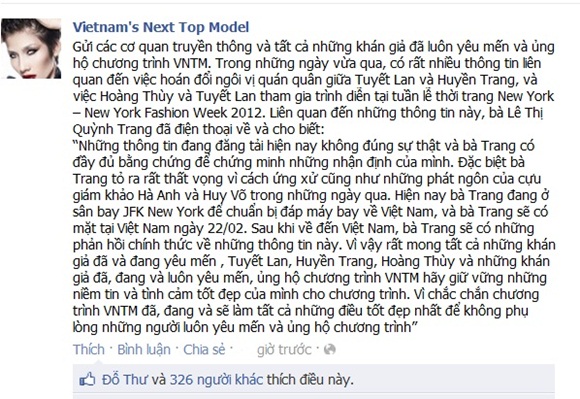 Cũng trong ngày hôm qua, đại diện của Vietnam’s Next Top Model đã lên tiếng và bày tỏ sự thất vọng về cách hành xử của siêu mẫu Hà Anh và NTK Huy Võ. Cư dân mạng đang hoang mang chưa biết ai đúng ai sai trong sự việc này nhưng fanpage anti Hà Anh đã được lập ra và rất nhiều người vào bày tỏ bức xúc.