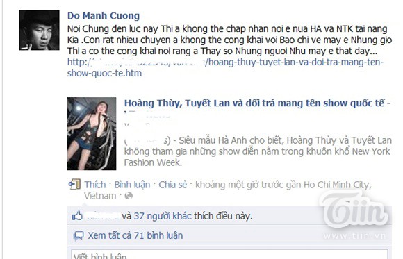 Như tin đã đưa, nguyên nhân dẫn đến mâu thuẫn giữa NTK Đỗ Mạnh Cường và Hà Anh là do “chân dài” này đã trả lời phỏng vấn báo chí rằng, Hoàng Thùy và Tuyết Lan không biểu diễn ở NewYork Fashion Week. Chỉ có Huyền Trang mới tham dự sự kiện này. NTK Đỗ Mạnh Cường bức xúc vì những lời nói vô căn cứ của Hà Anh.